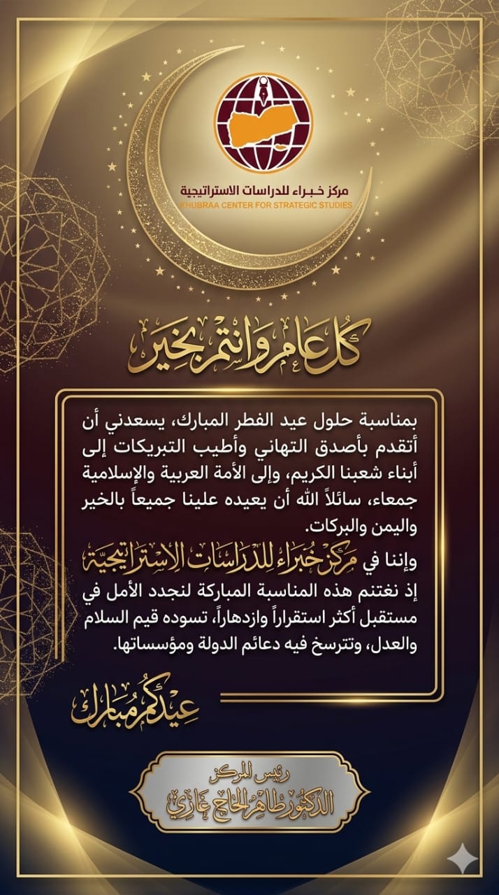 رئيس مركز خبراء للدراسات الاستراتيجية يهنئ الامة العربية و الاسلامية بمناسبة عيد الفطر المبارك بسم الله الرحمن الرحيمبمناسبة حلول عيد الفطر المبارك، يسعدني أن أتقدم بأصدق التهاني وأطيب التبريكات إلى أبناء شعبنا الكريم، وإلى الأمة العربية والإسلامية جمعاء، سائلاً الله أن يعيده علينا جميعاً بالخير واليمن والبركات.وإننا في مركز ...اقرأ أكثر
