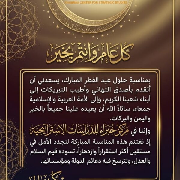 رئيس مركز خبراء يهنئ الامة العربية و الاسلامية بحلول عيد الفطر المباركHaithm Haithmمارس 20, 2026رئيس مركز خبراء للدراسات الاستراتيجية يهنئ الامة العربية و الاسلامية بمناسبة عيد الفطر المبارك بسم الله الرحمن ... اقرأ أكثر